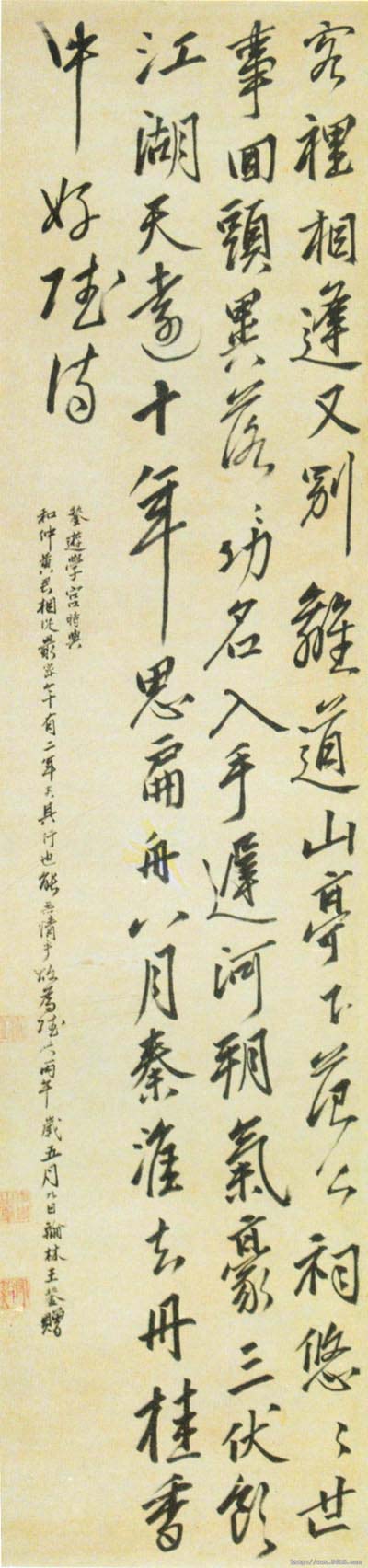 王鏊(1449-1524)字济之,别号守溪,学晚号震泽先生,苏州吴县人。乡试、会试皆第一,殿试一甲第三名。明正德间官至少傅、户部尚书、武英殿大学士。后归居苏州,致力于地方文献著述,纂有《姑苏志》、《震泽编》等。卒赠太傅,谥文恪。王鏊有书名,书法清劲爽健,结字纵长严谨,得峭拔风神。不足处似清健有余,沉稳不足,笔画略见干涩,这或许与硬毫书有关。