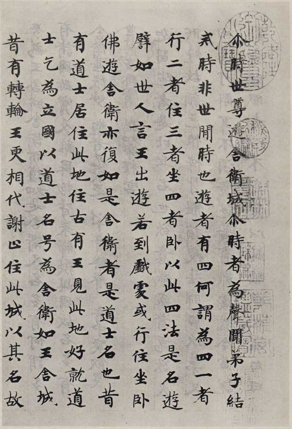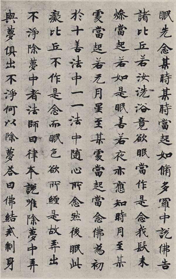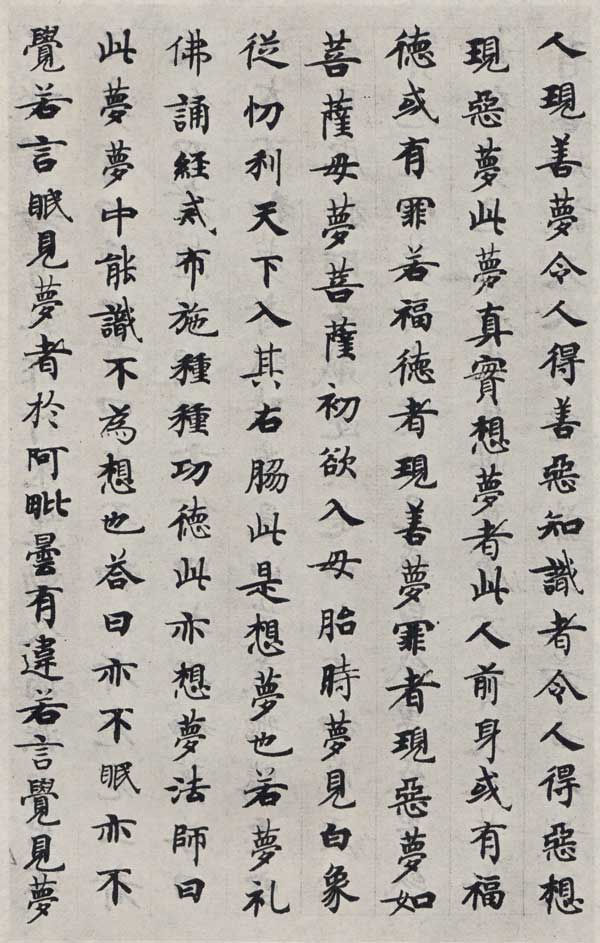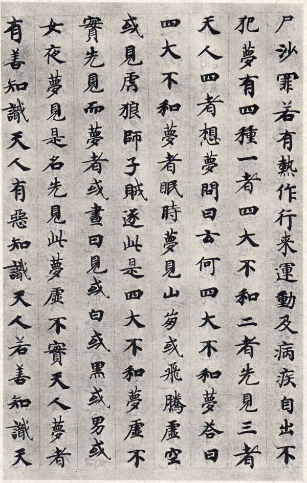 唐人写经,多不落名款,有的虽有名款但非名人,故以往书家并未给予足够注意。其实,由于唐代重书学,特别在中唐、盛唐,写经书法水平一般很高。《善见律》述释迦牟尼弘佛之事,卷末上端书“善见律卷”,下署“贞观廿二年十二月十日国诠写”。此卷经书工整,结构点画均匀秀劲,运笔灵活熟练,轻重适宜。全篇一气呵成,造诣精湛。