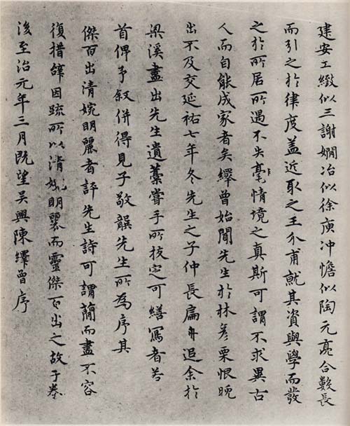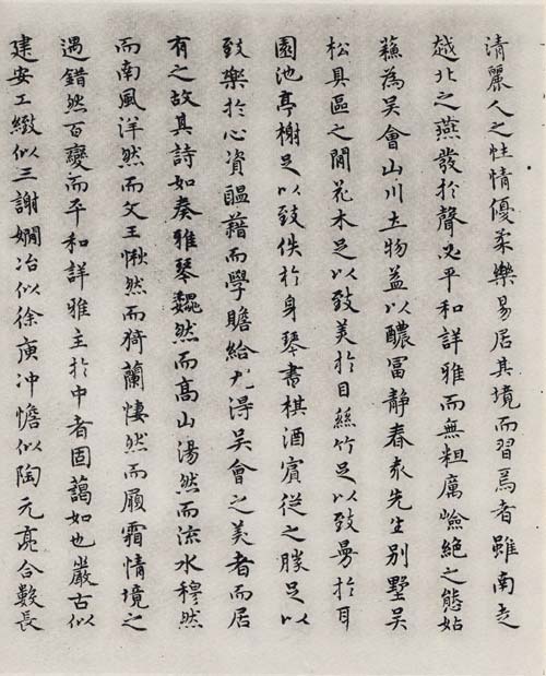 在这里,不得不提一下陈绎曾的《翰林要诀》这部重要著述。元代书法理论著作较多,有属于通论的,有属于丛辑的。陈绎曾所著《翰林要诀》属于书法技法类。该书对执笔法、血法、骨法、筋法、直法、圆法等各种方法,俱立种种名目,并一一进行论说,论述翔实独到。正因如此,人们对《翰林要诀》异常看重。他在“血法”一则中称:“字生于墨,墨生于水。水者,字之血。”又说:“笔尖受水,一点已枯矣。水墨皆藏于副毫之内,蹲之则水下,驻之则水聚,提之则水皆入纸矣。”陈绎曾对书写者情绪同书法的关系,论述得同样很精彩。他写道:“情有重轻,即字之敛舒险丽亦有浅深,变化无穷。”怎么变呢?具体说就是:“喜即气和而字舒,怒则气粗而字险,哀即气郁而字敛,乐则气平而字丽。”人欢喜时,心气和谐,写出来的字就舒展;人发怒时,心气粗闷,写来的字就险绝;人悲哀时,心气忧郁,写出来的字就内敛;人高兴时,心气平和,写出来的字就秀丽。总之,人喜怒哀乐的思想情趣、向往追求都会从字的神采、风格上反映出来。由此,再来观赏陈绎曾这件小楷作品,虽无惊人之态,却有隽永之趣。其笔画婉转,节奏缓和,结字落落大方,自然有致,险妙之处常以朴实平淡出之,给人以舒坦怡然的感觉,当是陈绎曾在平心静气的状态下写成的。作品全篇有萧远天然的雅致气息,绝无庸俗粗陋的野气,恰似一首清新和畅的田园诗,其中蕴涵着疏朗、儒雅、静穆的情调,只要你心潜其中,自会同作者一样,心生愉悦之感。