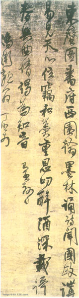 此作的第二个特点是:风格的内敛含蓄,这有两方面的表现。一是指他的用笔藏多露少,隐迹灭端。此作在起笔时注重逆藏,极少露锋,除了从上字的收笔处牵丝引带、笔断意连者,如“羹”、“深”的首笔,“诵”、“讲”的第二笔等之外,未见一处是露锋下笔的,收笔出锋者也极少。这就自然构成此作用笔含蓄的特点。另一方面,此作在结体上也以收束紧结、含蓄蕴藉为尚,结字多用王羲之、米芾的“花篮型”体式,即上部开放,下部收缩如一只装满鲜花的花篮,如“府”、“墨”、“酒”、“载”、“竭”、“为”等。这种体势的长处是热情、奔放而有节制,为情绪的宣泄和行气的畅贯留有充分的余地,同时也便于后面的字的牵丝引带。但这种体式在本作中不是惟一的。除了此种,还有上收下放的“金钟式”,如“林”、“闻”、“政”、“天”等,以及不收不放,平正雍和的体式,如“壁”、“讲”、“窃”,“歌”等,使此作在体式风格上显得多姿多彩。