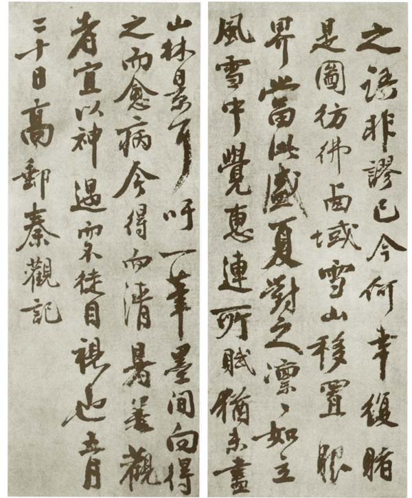 余曩卧病汝南。友人高符仲携摩诘辋川图。过直中相示。言能愈疾。遂命童持于枕旁阅之。恍入华子冈。泊文杏竹里馆。与斐(应作裴)迪诸人相酬唱。忘此身之匏系也。因念摩诘画。意在尘外。景在笔端。足以娱性情而悦耳目。前身画师之语非谬已。今何幸复睹是图。仿佛西域雪山。移置眼界。当此盛夏。对之凛凛如立风雪中。觉惠连所赋。犹未尽山林景耳。吁。一笔墨间。向得之而愈病。今得之而清暑。善观者宜以神遇而不徒目视也。五月二十日。高邮秦观记。